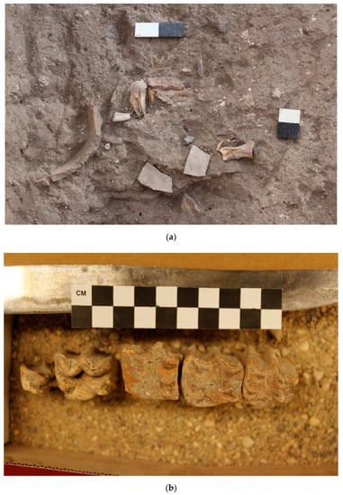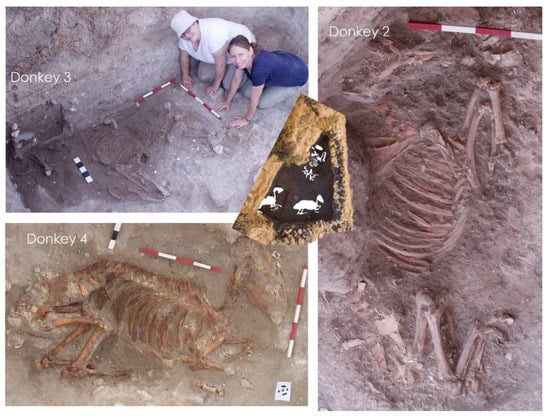 Foundation deposits are generally found under buildings and within walls. They are buried in specific places to consecrate and dedicate the buildings to deities and to keep the inhabitants and their contents safe from harm [94,95]. A variety of animals are found in such deposits during the Bronze Age, including cattle, horses, and donkeys [96,97,98,99].