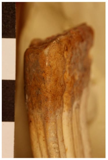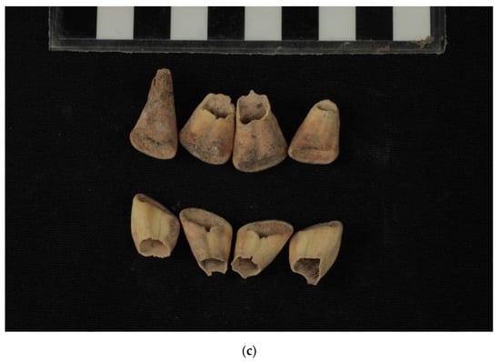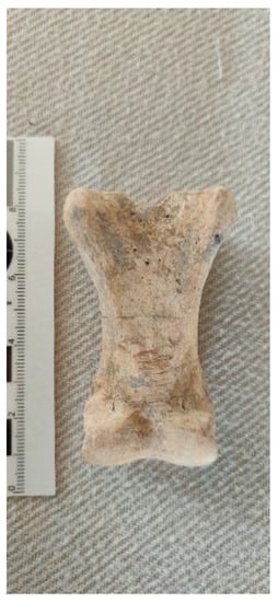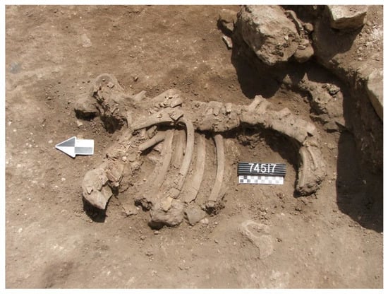This donkey burial is the clearest example of ritual internment [103,104]. The skeleton was carefully placed in the pit on its right side with the torso facing west (toward the setting sun); the front and hind legs were tied together (trussed) below the abdomen, and the upper neck (cervical) vertebra and cranium dismembered and placed on the abdomen facing east (toward the rising sun) (Figure 19). There was no evidence of any other objects found associated with the burial. It is evident the animal was sacrificed, the head fully cut off, and carefully placed on the abdomen facing in the opposite direction [103]. Both front legs are bent backwards at the humerus–radius/joint, and the hind legs are pushed forward so that they meet below the torso and parallel to the vertebral column. The only way that the legs could have been placed in this position, which is contrary to their natural state, would be if the legs were bound/trussed/tied together. It is likely that the donkeys were carried here by a pole through its tied legs. However, no evidence of rope remains were discovered in any of the burials. The skeleton was not buried in a haphazard manner by being dumped into the pit, nor did it fall into a pit naturally. It was slaughtered, carefully laid in the pit on its side, and the dismembered head laid on the stomach facing towards the rising sun before being covered up.