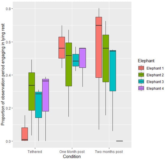 - Williams, E.; Bremner-Harrison, S.; Harvey, N.; Evison, E.; Yon, L. An Investigation into Resting Behavior in Asian Elephants in UK Zoos. Zoo Biol. 2015, 34, 406–417. [Google Scholar] [CrossRef] [PubMed]