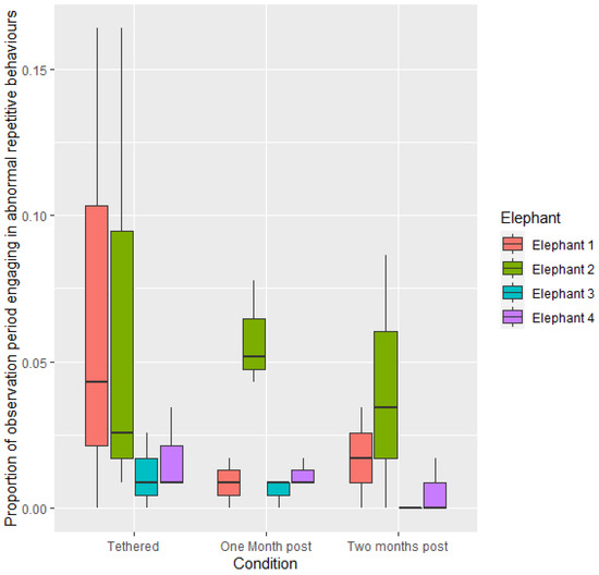- Friend, T.H.; Parker, M.L. The Effect of Penning Versus Picketing on Stereotypic Behavior of Circus Elephants. Appl. Anim. Behav. Sci. 1999, 64, 213–225. [Google Scholar] [CrossRef]
