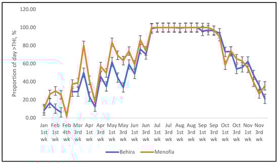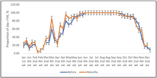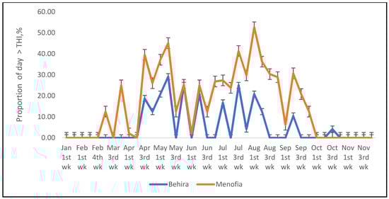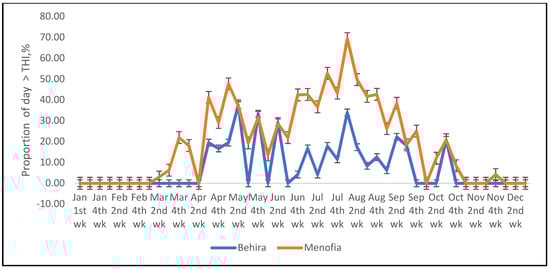 The proportion of half-hour periods in the day that cattle at the two locations (Behira and Menofia) in 2021 experienced THI greater than that believed to cause heat stress.