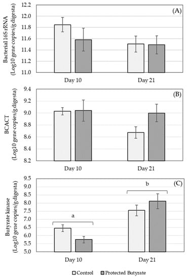 Concentration of gene copies in caecum ingesta of (A) bacterial 16S rRNA, (B) butyryl-CoA acetate CoA transferase (BCACT) and (C) butyrate kinase on different days of age (10 and 21) in broilers treated with protected butyrate compared to the control group. Bars represent the group means and error bars the standard error of the mean. Bars labelled with different letters are significantly different in terms of age (p ≤ 0.001).