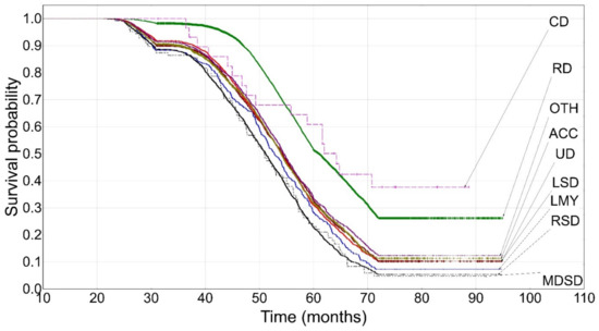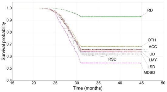 The Kaplan–Meier survival probability until the first lactation. UD—udder diseases, RD—reproductive disorders, MDSD—metabolic and digestive system diseases, RSD—respiratory system diseases, LSD—locomotor system diseases, ACC—accidents, OTH—others, LMY—low milk yield.