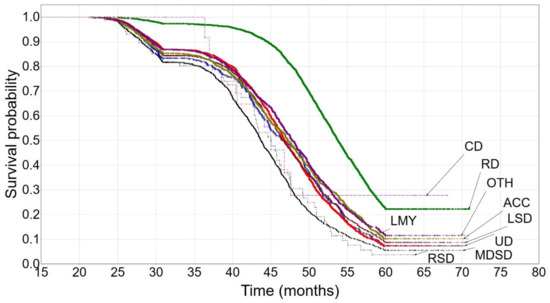 The Kaplan–Meier survival probability until the second lactation. UD—udder diseases, RD—reproductive disorders, CD—contagious diseases, MDSD—metabolic and digestive system diseases, RSD—respiratory system diseases, LSD—locomotor system diseases, ACC—accidents, OTH—others, LMY—low milk yield.