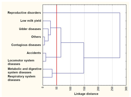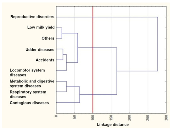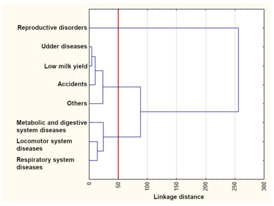 The results of the cluster analysis using Ward’s method are presented in Figure 4, Figure 5 and Figure 6. As can be seen from these figures, three clusters could be distinguished for the first lactation and the first two lactations, whereas four clusters were formed for the first three lactations. The reproductive disorder category clearly differed from the remaining ones and constituted a separate cluster in each of the three lactation groups. On the other hand, udder disease and low milk yield categories were similar and grouped in the same cluster in all dendrograms. Metabolic, digestive, and respiratory system diseases also occurred in one cluster for all lactation groups. The remaining categories rarely constituted separate clusters. In the third lactation group, locomotor system diseases and accidents formed a new separate cluster.