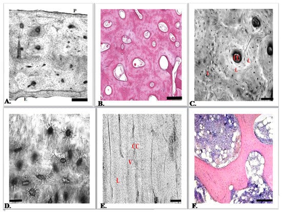 Histological structure of normal bone tissue. (A) A cross-section of a properly structured bone showing the compact bone. The photograph of the area of an unstained section of compact bone. Visible osteons with concentric lamellae arranged around central canals (Haversian canal). Externally visible periosteum (P), cancellous bone covered by endosteum (E). Ground bone; scale bar: 2 mm. (B) A cross-section of a properly structured bone showing compact bone. Because the osteons are located very close together, compact bone is stronger and harder than spongy bone. Haversian canals contain blood vessels and supply developing bone with essential nutrients. Small trabeculae create a highly porous medullary bone. They provide support, offering considerable strength without significantly increasing the weight of the bone. H & E section; scale bar: 100 µm. (C) Osteons are structural and functional units, characteristic of compact bone. An osteon with concentric lamellae (L) surrounding a central canal (CC) is shown. The interstitial lamellae of the osteon are also visible; these are remnants of old osteons; ground bone; scale bar: 10 µm. (D) Photomicrograph of osteocytes and their associated processes. Through these long processes, cell-to-cell communication takes place and substances needed by the cells are transferred. Ground bone; scale bar: 5 µm. (E) Longitudinal section of the compact bone. Visible Haversian canal (H) connected to the transverse perforating canal (Volkmann) (V). Osteocytes embedded with lamellae (L). Ground bone; scale bar: 200 µm. (F) Histological structure of spongy bone. This structure is characteristic of bone marrow. Bone trabeculae surround the bone marrow along with blood vessels, and this arrangement strengthens the spongy bone, making it stronger. H & E section; scale bar: 50 µm.
