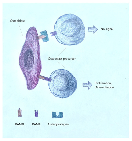 On the surface of osteoblasts, there is a RANKL glycoprotein that can bind to the RANK glycoprotein on the surface of the osteoclast precursor. This is a way to directly contact these cells and stimulate osteoclast differentiation (Figure 2). Osteoblasts secrete proteins that initiate and regulate bone mineralization: osteonectin, osteocalcin, and hydrolases. They also secrete a protein, osteoprotegerin, which binds to RANKL and prevents osteoblast–osteoclast contact. This inhibits osteoclast precursor differentiation, stabilizes bone, and regulates bone modeling. In addition, it has an inhibitory effect on blood vessel calcification. Osteoblast activity is regulated by parathormone, thyroid hormones, growth hormone, vitamin D3, cytokines, growth and differentiation factors, and prostaglandins. Adrenal corticosteroids inhibit the activity of these cells [24,28,29,30,31,32].