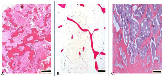Histological structure of altered bone tissue. (A) Paget’s disease is a bone disorder. Histologically, the bone appears mosaic in appearance. It has thick cement lines that demarcate the disorderly lamellar bone. Such extensive trabeculae and lack of organization of the cortex are the cause of the loss of resistance to strain and therefore greatly increase the susceptibility to fracture. H & E section; scale bar: 200 µm. (B) In osteoporotic bone, there is an increased amount of adipose tissue appearing in the intertrabecular area. Therefore, for the same volume, the bone has much less density but is more frangible. Increased medial adiposity, associated with intratrabecular connectivity, emphasizes the functional connection between bone and marrow. Thin trabeculae are separated from each other. H & E section; scale bar: 100 µm. (C) Longitudinal section of the cancellous bone of the obese rat. Visible network of trabeculae separated by intercellular spaces containing islands and clusters of haematopoietic cells admixed with adipocytes. H & E section; scale bar: 500 µm.
