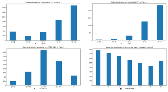 Distribution of the ANN data according to (a) RSV1, (b) RSV2, (c) litter size, and (d) parity number from Farm 1.