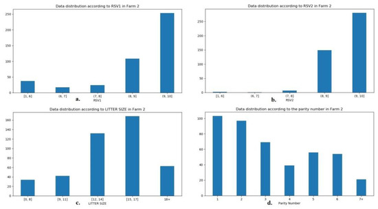 Distribution of the ANN data according to (a) RSV1, (b) RSV2, (c) litter size, and (d) parity number from Farm 2.