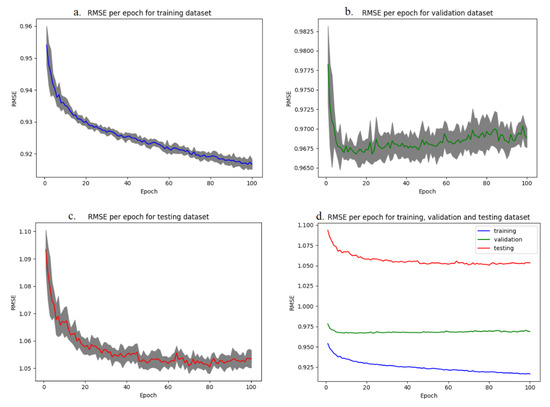 The progress of the RMS values over 100 epochs, obtained by the employed ANN, along with their standard deviations are illustrated in Figure 3. In charts (a), (b), and (c) the RMSE and s.d. for training, validation, and testing are presented. Chart d. contains all three series under the same scale for the purpose of comparison.