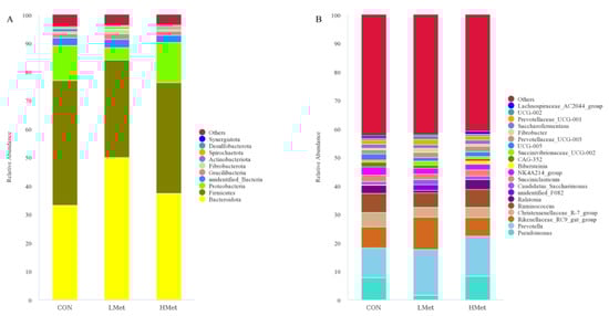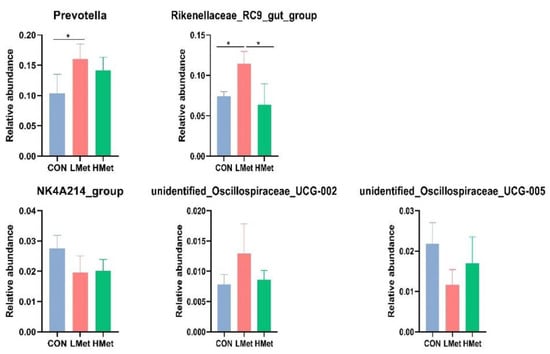 The PCoA results and adonis analysis showed (Figure 3) that the colony composition of the LMet group was significantly separated compared with that of the CON and HMet groups based on the unweighted UniFrac distance, Bray–Curtis distance, and weighted UniFrac distance matrices (adonis: p < 0.05 (CON vs. LMet, LMet vs. HMet)), while the colony composition of the CON and HMet groups was not significantly separated (adonis: p > 0.05 (CON vs. HMet)) (Table 7). By comparing the differences in the relative abundance of bacteria at the genus level, the relative abundance of Prevotella was found to be significantly higher in the LMet group than in the CON group, and the relative abundance of Rikenellaceae_RC9 was substantially higher than that in the CON and HMet groups (p < 0.05). In addition, a decreasing trend was observed in the abundance of NK4A214 in the LMet and HMet groups compared with the CON group (p < 0.1). Meanwhile, the relative abundance of unidentified_Oscillospiraceae_UCG-005 and UCG-002 was also a trend in the relative abundance of the LMet group compared with the CON group.