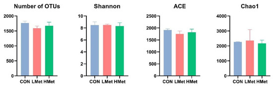 Table 6 shows that methionine supplementation did not have a significant effect on the volatile fatty acids in the rumen of the three groups of sika deer. However, the total volatile fatty acid content increased in the LMet group, and the range of different types of volatile fatty acids changed. In addition, the microbial protein concentration of the rumen fluid was significantly higher in the LMet group than in the CON group (p < 0.05). The pH of the rumen fluid increased with the level of methionine supplementation, but the changes were not significant.