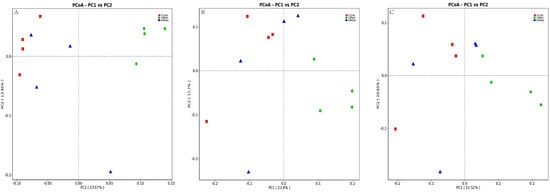Comparisons of the bacterial communities in the rumen of sika deer. Principal coordinate analyses based on unweighted UniFrac distances (A), Bray–Curtis distance (B), and weighted UniFrac distance (C).