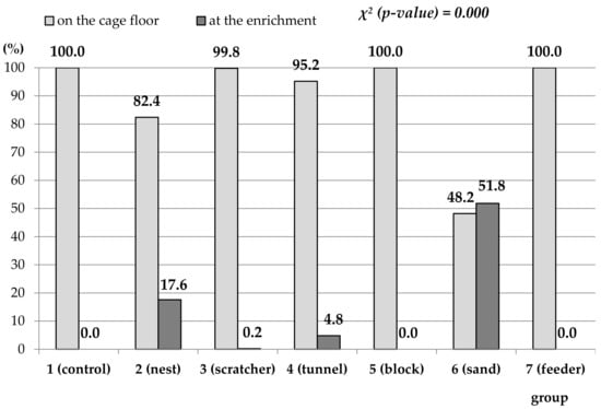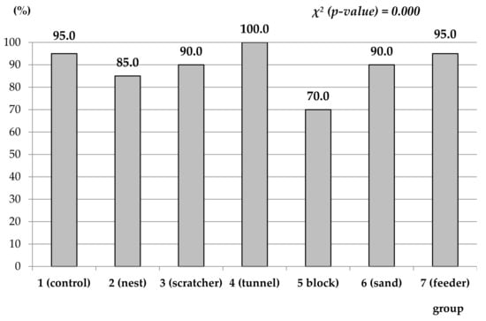 | Group (Enrichment) | 1 (Control) | 2 (Nest) | 3 (Scratcher) | 4 (Tunnel) | 5 (Block) | 6 (Sand) | 7 (Feeder) | Total | χ2 Test (p-Value) | |