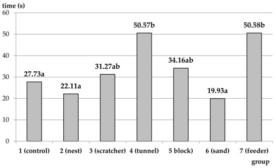 | Number of objects chosen during the test | 4.50 ab | 4.75 b | 3.75 ab | 4.50 ab | 4.75 b | 4.00 ab | 3.50 a | 0.115 |