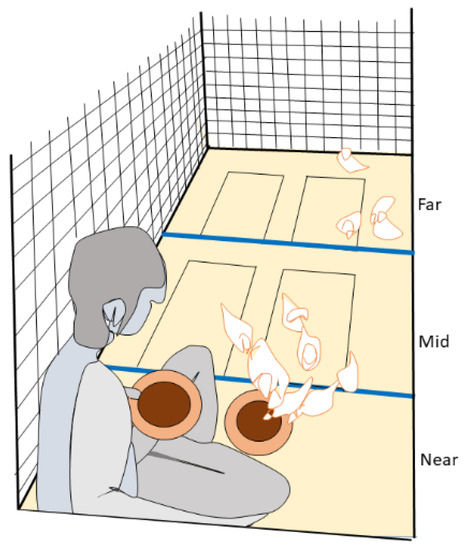This test can be considered as a series of challenges that the chicks have repeated opportunities to overcome, in order to access the food reward. Given that the chicks were initially allowed to move to the far end of the pen, the latencies for overcoming consecutive challenges can be placed in the following order: latency to approach the mid and then the near part of the pen (Figure 2), latency to peck in the bowl on the ground (repetitions 1–6), latency to jump up onto the person, and, finally, latency to peck in the bowl on the person’s lap (repetitions 4–6). The latency recorded was the time for the first chick in the pen to overcome the challenge. Additionally, the number of chicks in each area of the pen (far, mid, near) every 10 s and the total number of pecks to each bowl were determined. The total number of worms eaten in each bowl was registered by counting the number of worms remaining in the bowl at the end of the test, as an indicator of overall success. The test can therefore reflect coping, as well as exploration and learning. All measures, apart from counting the number of worms, were made by the same observer from the video recordings. Before the analysis, an intra-observer reliability of CV < 10% was secured for all behavior variables.