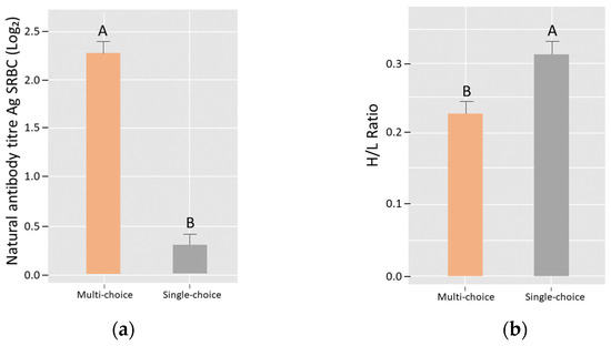 Immunological effects of “multi-choice” and “single-choice” treatments for (a) natural antibody titer against sheep red blood cells (SRBC), presented as the Log2 of the highest dilution yielding significant agglutination (mean and SE; “multi-choice”: 39; “single-choice”: 40 chicks were analyzed) and (b) H/L ratio (estimated marginal mean and SEM; “multi-choice”: 36; “single-choice”: 39 chicks were analyzed) in blood sampled from 16-day-old domestic fowl layer chicks. Different letters (A,B) indicate significant treatment differences.