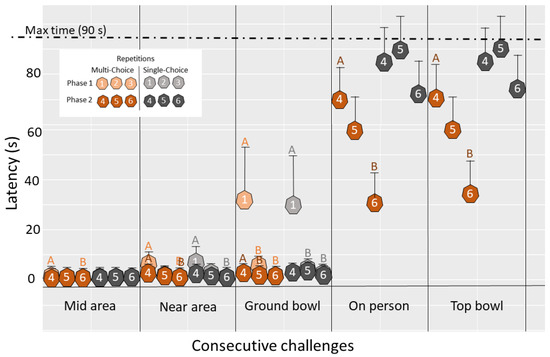 The approach dynamics in the repeated opportunity test. Dot plot (estimated marginal mean and SEM) showing the approach dynamics with each repetition during the repeated opportunity test of chicks from “multi-choice” and “single-choice” treatments. The first phase (repetitions 1–3) involved one food bowl on the ground, while the second phase (repetitions 4–6) involved a person inside the pen, one food bowl on the ground and another in the lap of the person. Latencies to overcome the challenges are shown in seconds, to enter the mid area, to enter the near area, to peck in the ground food bowl, to jump up on the person where the top food bowl was located, and, finally, latency to peck in the top food bowl. Different letters (A,B; note also the different shades within each color) indicate significant differences between repetitions, i.e., improvements with repetition, within each treatment and the different phases of the test.