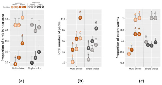 The response dynamics in the repeated opportunity test. Dot plot (estimated marginal mean and SEM) showing the response dynamics with each repetition during the repeated opportunity test for chicks from the “multi-choice” and “single-choice” treatments, regarding (a) the proportion of chicks located in the near area (the area where the ground food bowl was located for repetitions 1–3 and where both food bowls and the test person were located in repetitions 4–6), (b) the total number of pecks to feed bowl(s), and (c) the proportion of worms eaten during each repetition. Different letters (A,B; note also the different shades within each color) indicate significant differences between repetitions within treatments and phases.