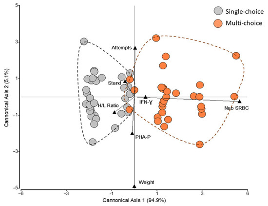 Figure 6 shows a lineal discriminant analysis using those variables measured individually for chicks in this study: inflammatory response against PHA-P, Nab production against SRBC, H/L ratio, IFN-Ɣ plasmatic concentrations, weight gain, latency to stand up, and number of attempts to induce the tonic state in a TI test. The two treatments are defined by the distribution of the colored dots in the discriminant space determined by the canonical axes. The figure shows an effective discrimination of the individuals according to their a priori treatment: being reared in “multi-choice” or “single-choice” environments. This discrimination can be clearly observed in canonical axis 1 (94.9% of variability between the groups explained), for which natural antibody titers against SRBC and the heterphil/lymphocyte ratio are the two most important (discriminant coefficients of 0.98 and 0.20, respectively).