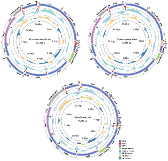 The complete mitogenomes of C. keduensis and P. panicola have a size of 16,138 bp and 16,059 bp, respectively, which are comparable to that of another Cerataphidini species P. bambucicola (16,632 bp). In contrast, N. piri has a larger mitogenome than C. keduensis, P. panicola and most other aphids, which is 17,033 bp in length and similar to that of S. sinisalicis (17,109 bp) from the same subfamily Lachninae (Table 1 and Table S1). The circular maps for three mitogenomes are shown in Figure 1. All three aphid mitogenomes have a typical set of 37 insect mitochondrial genes, including 13 PCGs, 2 rRNAs, and 22 tRNAs. Of these genes, 14 tRNAs and 9 PCGs are encoded on the major strand (J-strand), and the other 14 genes, including 8 tRNAs, 4 PCGs, and 2 rRNAs are encoded on the minor strand (N-strand) (Tables S2–S4). There is also a non-coding control region and a tandem repeat region in all three mitogenomes. As with all other aphid species, the three newly sequenced mitogenomes also exhibit strong AT bias, with A + T contents of 84.9%, 85.0%, and 83.9% for C. keduensis, P. panicola, and N. piri, respectively. All three mitogenomes present a positive AT skew and a negative GC skew (Table 2), which is congruent with other known aphid mitogenomes [,].