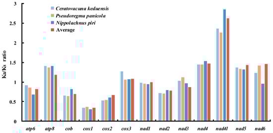 Non-synonymous/synonymous mutation (Ka/Ks) ratios of PCGs in Ceratovacuna keduensis, Pseudoregma panicola and Nippolachnus piri and the average Ka/Ks ratios of PCGs in all known aphid mitogenomes.