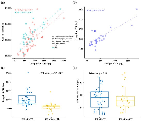 Genomic characteristics of 56 aphid mitogenomes analyzed in this study. (a) Correlation between mitogenome size and the length of control region (CR) or repeat region (RR). The correlations were tested using Pearson’s correlation coefficient. The same as bellow; (b) correlation between the lengths of control region and inserted tandem repeats (TR); (c) the length and (d) A + T content of control regions with or without tandem repeats. p < 0.05 denotes statistically significant difference between the two groups (Wilcoxon test).