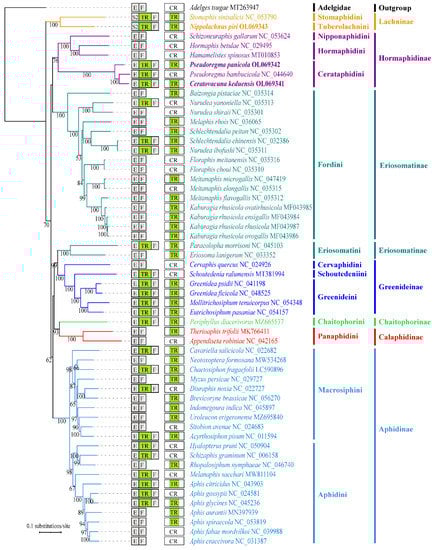 Aphid phylogeny and distribution pattern of tandem repeats in aphid mitogenomes across different clades. Bootstrap support values are indicated by numbers on nodes of phylogenetic tree, and only values > 50% are displayed. Tandem repeats (TR) include repeat sequences between trnE (E) and trnF (F) and those inserted into the control region (CR). “CR” is shown in the figure only if there is no TR in the control region. Different aphid subfamilies are indicated by different colors. Three aphid species in this study are highlighted in bold. S2, trnS2.