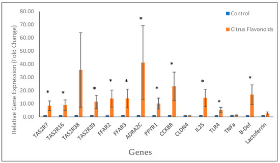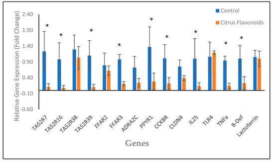 Gene expression in duodenum of Holstein bulls fed high-concentrate diets with or without citrus flavonoids supplementation (* = p < 0.05). TAS2R7: bitter taste receptor 7; TAS2R16: bitter taste receptor 16; TAS2R38: bitter taste receptor 38; TAS2R39: bitter taste receptor 39; FFAR2: free fatty acid receptor 3 (gpr41); FFAR3: free fatty acid receptor 2 (gpr43); ADRA2C: alpha 2 adrenergic receptors subtype C; PPYR1: pancreatic polypeptide receptor 1; CCKBR: cholecystokinin receptor 4; IL-25: interleukin-25; TLR4: pattern recognition receptors, such as Toll-like receptor 4; TNFa: tumor necrosis factor alpha; B-Def: beta-defensin.