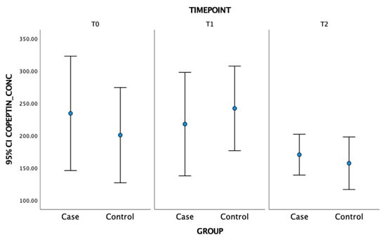 Mean concentrations of copeptin (pg/mL) measured in saliva before (T0), immediately (T1) and 10 min after (T2) separation from the owner in dogs from both groups (N = 25). No group differences across the timepoints were detected (p > 0.05).