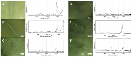 Raman spectra of microplastics found in the filters of samples of internal tissues of different companion animals: (A,B) polypropylene particle in cat liver; (C) polyethylene terephthalate particle in cat ileum; (D) polyethylene terephthalate in cat blood clot; (E) polypropylene particle in dog lung; (F) polyethylene terephthalate particle in dog lung. Edited in Adobe Photoshop CS6 to improve brightness and contrast by 50 and 30, respectively. Original colors can be found in Figure S2, Supplementary Materials.