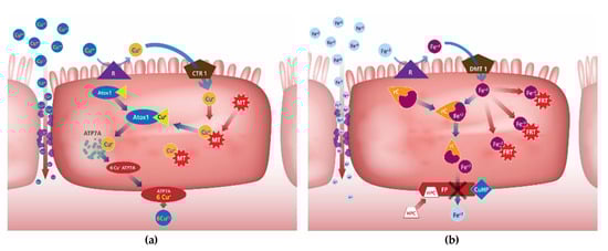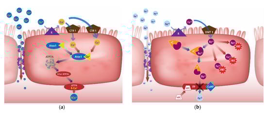 Brush border Cu metalloreductases (R) convert dietary Cu2+ to Cu+ and a Cu transporter protein (CTR1) facilitates diffusion of the Cu+ across the apical membrane where it becomes bound to a Cu chaperone protein (Atox1) [118,126]. Subsequently, Atox1 shuttles the Cu+ to the Golgi apparatus, where it is transferred to a Cu transport protein (ATP7A) capable of holding six Cu+ ions that is within the membrane of a Golgi transport vesicle (Figure 2a). It has also been suggested that DMT1 acts as a minor pathway [127] and a Cu/Cl cotransport mechanism has also been proposed [128].