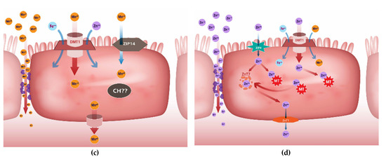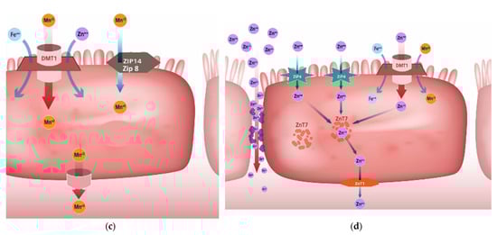 Transcellular absorption of Mn2+ involves the use of divalent metal transporters such as DMT1, ZIP8 and ZIP14 to move Mn (and other metals) across the apical membrane (Figure 2c) [66,119].