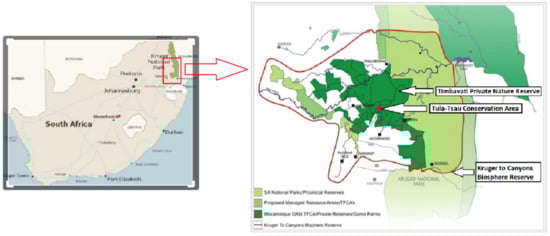 This study was conducted at the Tula-Tsau Conservation Area (7 km2), a fenced wildlife area in the Kruger to Canyons Biosphere, Limpopo Province, South Africa. The Tula-Tsau Conservation Area is part of an important buffer area (Greater Kruger Environmental Protection Zone (GKEPZ)) between the Kruger National Park, rural communities, and the semi-urban town of Hoedspruit (Figure 1).