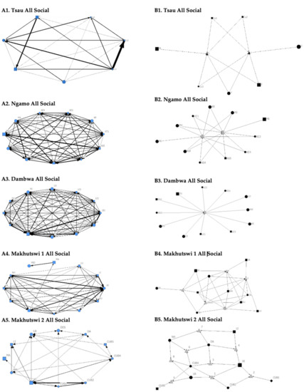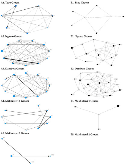 Sociogram (A1–A5) and clique (B1–B5) matrices of all social interactions, per pride. For both matrix types, squares (male), circles (female) and diamond (unknown sex) are nodes, representing individual lions, with node size indicating lion age (larger the symbol, the older the lion). For the sociograms, line thickness between dyads represents the strength of the association between lions. For the cliques, triangles signify a clique.