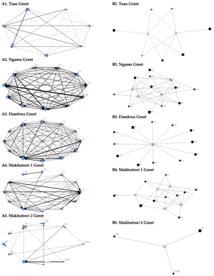 Sociogram (A1–A5) and clique (B1–B5) matrices of greet interactions, per pride. For both matrix types, squares (male), circles (female) and diamond (unknown sex) are nodes, representing individual lions, with node size indicating lion age (larger the symbol, the older the lion). For the sociograms, line thickness between dyads represents the strength of the association between lions. For the cliques, triangles signify a clique.