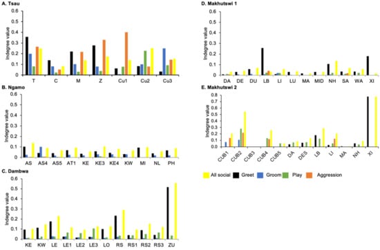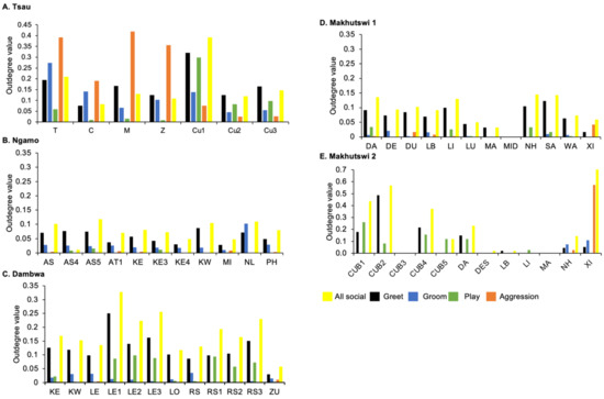 Social interaction networks for all prides were not significantly associated with the random network, indicating that the interactions were non-randomly distributed within each of the prides (Appendix A: Table A3, Table A4, Table A5, Table A6 and Table A7). The degree to which individuals initiated and received interactions within each pride indicated their role within an interaction (Figure 8 and Figure 9). There was no significant correlation between initiated and received social interactions for the Tsau pride for any network (p > 0.05) (Appendix A: Table A1), indicating that social interactions were more evenly split between pride members and suggesting a high level of connectedness. In contrast, for the Dambwa and Makhutswi prides, all social indegrees and outdegrees were negatively correlated (π = −0.727, p = 0.007; π = 0.729, p = 0.002), and for the Makhutswi 2, pride all social indegrees and outdegrees were positively correlated (π = 0.712, p = 0.009), indicating that social interactions for these networks were less evenly split between pride members. For the Tsau, Dambwa and Makhutswi 2 prides, pride members who initiated the most cumulative social interactions were also found to initiate the most greetings (π = 0.955, p < 0.001, π = 0.767, p = 0.000, and π = 0.855, p < 0.001). The test of association for the Tsau pride found no correlation between the centrality for greeting, grooming or aggression and any outdegree or indegree social interactions (p > 0.05) (Appendix A: Table A2), indicating that the lions who were central to these networks did not receive or initiate the most social interactions for those networks. A positive association was found for the Tsau pride between the grooming and greeting social interactions (rM = 0.4297, p = 0.0384) and between grooming and all social interactions (π = 0.46715, p = 0.0393).