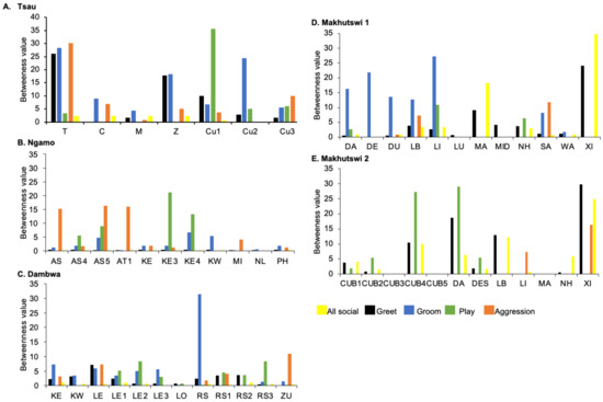 Across all prides, subadults were most likely to receive grooming interactions (Tsau = Cu3, Ngamo = AS4, Dambwa = LE1, Makhutswi 1 = DA, Makhutswi 2 = Cub2) (Figure 5 and Figure 6). For each pride, an adult female and pride subadults had the highest betweenness centrality for the grooming network (Figure 7), with cubs/sub-adults most likely to receive and adult females or adult males (when involved) to initiate interactions (Figure 4 and Figure 5). Pride males, in all prides except the Tsau pride, were the least likely to receive grooming interactions, and for the Ngamo and Makhutswi 1 prides, initiated the least number of this interaction type. In contrast, for the Makhutswi 2 pride, the pride male (XI) initiated the most grooming interactions. For the Tsau pride, adult female C and cubs Cu1 and Cu2 received a lower number of grooming interactions compared to the pride males. A positive association between grooming and all social interactions for four of the prides was found: Tsau (rM = 0.4672, p = 0.0393), Ngamo (rM = 0.2896, p = 0.0114), Makhutswi 1 (rM = 0.1944, p = 0.0372), and Makhutswi 2 (rM = 0.6750, p = 0.0030). No association between grooming indegree and grooming outdegree nor between grooming centrality and any of the other indegree or outdegree social interactions was observed (p > 005) (Appendix A: Table A1 and Table A2).