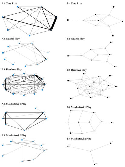 Sociogram (A1–A5) and clique (B1–B5) matrices of play interactions, per pride. For both matrix types, square (male), circles (female) and diamond (unknown sex) are nodes, representing individual lions, with node size indicating lion age (larger the symbol, the older the lion). For the sociograms, line thickness between dyads represents the strength of the association between lions. For the cliques, triangles signify a clique.