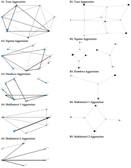 For the aggression matrix, the Tsau pride was the only pride to have all pride members involved and mostly connected in this social network, but still had four cliques, indicating that interactions were not distributed evenly (Figure 6). Most aggression interactions were acts of discipline directed towards the male Cub1 from both adult males and adult female T, with aggression also observed as a territorial or defensive display between the adult males and between the adult males and adult female T. Aggression interactions from adults, particularly parents, towards pride cubs/sub-adults were observed for all prides, while some interactions between adult pride members were also observed. A positive association was found between aggression and the cumulative social interactions for the Makhutswi 1 (rM = 0.2353, p = 0.0341) and Makhutswi 2 prides (rM = 0.8035, p = 2.0006 × 10−13). No association between aggression indegree and aggression outdegree was found for the Tsau pride (π = 0.536, p = 0.498), nor any association between aggression centrality and any indegree or outdegree networks (p > 0.05) (Appendix A: Table A2), indicating that the lion that was central to this network (adult lioness T) did not receive or initiate the most social interactions for those networks.