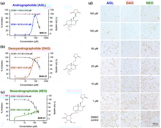 The cytotoxicity of AGL, DAG, and NEO was evaluated with a wide range of these compound concentrations using the MTS assay. After incubation with the andrographolides at concentrations up to 150 µM for 24 h, mild and moderate cytotoxic effects of these andrographolides on BHK-21 and HEK 293T cells were observed at 100 and 150 µM, respectively, using an inverted microscope. The CC50 values of AGL, DAG, and NEO tested with HEK 293T cells were higher than those with BHK-21 cells (Table 1), indicating that BHK-21 cells were slightly susceptible to the andrographolides. The CC10 values were also determined as the baseline concentrations of the andrographolides that caused 10% cell death. Therefore, the treatment with a compound at the CC10 concentration would result in at least 90% viable cells compared to the DMSO control. In the following experiments, CC10 values would be used as maximum doses of non-cytotoxic concentrations whenever the specific doses were higher than the CC10.