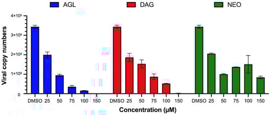 The antiviral activity was determined by incubating the andrographolides with BHK-21 cells after 2 h of FMDV infection for 24 h and detecting viral antigens by IPMA. The IPMA results revealed that DAG could inhibit FMDV replication to a greater extent compared to its parental form (AGL), as the numbers of FMDV-infected cells with brown cytoplasmic staining in the wells treated with 50–150 µM DAG were less than in the AGL treated wells (Figure 1). The EC50 value of DAG was 36.47 ± 0.07 µM with a high SI value of 9.22, and AGL-EC50 was 52.18 ± 0.01 µM with an SI value of 2.23 (Table 2). However, NEO had a minimal antiviral effect with the EC50 > 500 µM, as shown in Figure 1 and Table 2. In addition, the viral nucleic acids from intra- and extracellular viruses were quantified after the infected cells were treated with the andrographolides for 24 h. The viral nucleic acids significantly decreased in cells treated with AGL and DAG in a dose-dependent manner, while NEO reduced viral replication to a lesser extent (Figure 2). The results of IPMA and RT-qPCR were consistent with infected cells and viral copy numbers reduced in response to the increasing doses of andrographolides (Figure 1 and Figure 2).