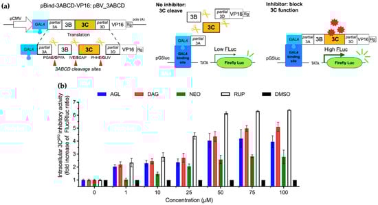 Inhibitory effects of AGL, DAG, and NEO on protease activity of FMDV 3Cpro in the intracellular protease assay: (a) The schematic diagram of the intracellular protease assay. In this assay, pBV_3ABCD and pG5luc were co-transfected into HEK 293T cells for transient FMDV 3Cpro expression. In pBV_3ABCD transfected BHK-21 cells, the active 3Cpro cut the polyprotein at the cleavage sites and thus separated VP16 activating domain from Gal4 binding domain. As a result, VP16 was not activated leading to low level of firefly luciferase expression. When andrographolides inhibit protease activity of the 3Cpro, the polyprotein is not cleaved. Thus, binding of GAL4-binding domain to GAL4 brought the VP16 activation domain in proximity to the VP16 and drove the firefly luciferase expression; (b) The protease activities of FMDV 3Cpro were determined based on the signal from the firefly luciferase (FLuc) normalized with that of Rinella luciferase (Rluc) from the pG5luc reporter plasmid. The data were presented as the fold increase in FLuc/Rluc ratios from treatments relative to controls (0.01% DMSO). Rupintrivir served as the 3Cpro inhibitor control. The experiments were carried out in triplicates, and the data were present as means and SD.
