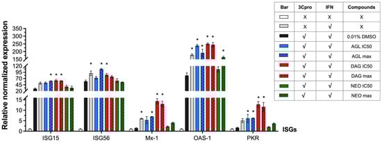 It has been shown previously that FMDV 3Cpro had an IFN antagonist activity which in turn inhibited the expressions of interferon stimulating genes (ISGs) such as IFN-stimulated gene 15 (ISG15), ISG56, 2′,5′-oligoadenylate synthetase (OAS), myxovirus resistance 1 (Mx1), and double-stranded RNA-dependent protein kinase R (PKR) [29]. In this study, we investigated whether the andrographolides reduced the protease activity of FMDV 3Cpro and interfered with its IFN-antagonist activity by observing the transcript levels of ISGs. The HEK 293T cells were transfected with pBV_3ABCD for 2 h to allow the 3Cpro transient expression, followed by incubating with andrographolides for 24 h and subsequently treated with IFN β for 8 h. The cells were collected for ISG mRNA quantification by RT-qPCR. pBV_mu3ABCD, pBV, and the mock controls were included as 3Cpro negative, vector, and non-drug controls, respectively. AGL, DAG, and NEO were used at the concentrations of IC50 and IC90 or CC10 (Table 2). As the IC90 values of AGL and NEO were higher than their CC10, the concentrations of both andrographolides at CC10 were used in the experiments to avoid irregular transfection efficiency among the experimental units caused by compound-induced cell cytotoxicity.