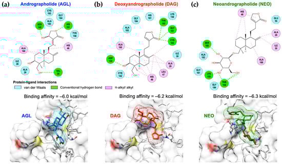 To reveal the mechanism of FMDV 3Cpro inhibition by the andrographolides, molecular docking was performed to assess the specificity of the andrographolides to the FMDV 3Cpro active sides. In silico analysis revealed that AGL, DAG, and NEO could occupy the protease active site of FMDV 3Cpro with the binding affinity of −6.0, −6.2, and −6.3 kcal/mol, respectively (Figure 5).