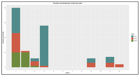 The study material consisted of 121 Common Eiders captured incidentally (bycaught) in gillnet fishing gears in the Sound (Øresund), a strait that connects the Baltic Sea with the Kattegat (Figure 1) between the 23 January 2017 and the 12 March 2019 (Figure 2). We consider the samples investigated in this study to be unbiased, since they were collected regardless of any health issues observed in the population and covered a period of three years and all seasons. All the animals were collected within 24 h after the nets were hauled out, then stored at −20 °C and thawed for approximately 36 h at room temperature prior to dissection.