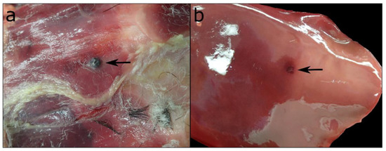 (a) Gunshot pellet in the subcutis of the abdomen with (b) a focal, superficial impression on the liver tissue of the same bird.