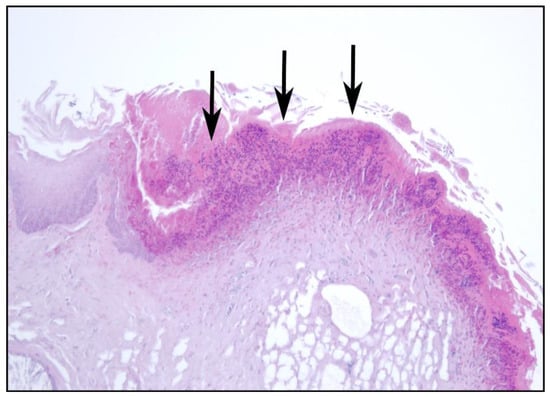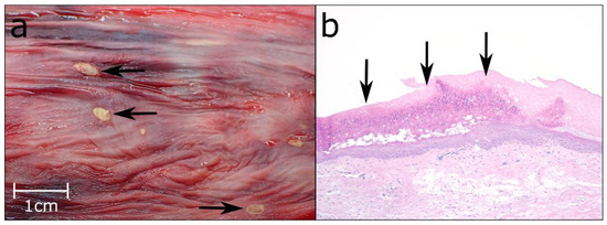 (a) Multifocal ulcerations of the oesophageal mucosa (black arrows). (b) Pustular lesions in the oesophageal mucosa (black arrows), Hematoxylin & Eosin (HE), 10×.