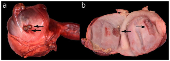 By far the most commonly affected organ was the intestine (Figure 8). In 95 (78.5%) cases, a parasitic infection with acanthocephala was recorded during necropsy. In 20 of these animals, different developmental stages of parasites were also detected via histological examination, including eggs in four animals and adult specimens of metazoan parasites, which were not identified further. In three additional cases, metazoan parasites were only visible histologically. In approximately 45% of all cases (n = 42), the acanthocephalans were correlated with enteritis, which was predominantly granulomatous/pyogranulomatous (n = 37), or in fewer cases, lymphocytic (n = 10), ulcerative (n = 3) and necrotising (n = 1).